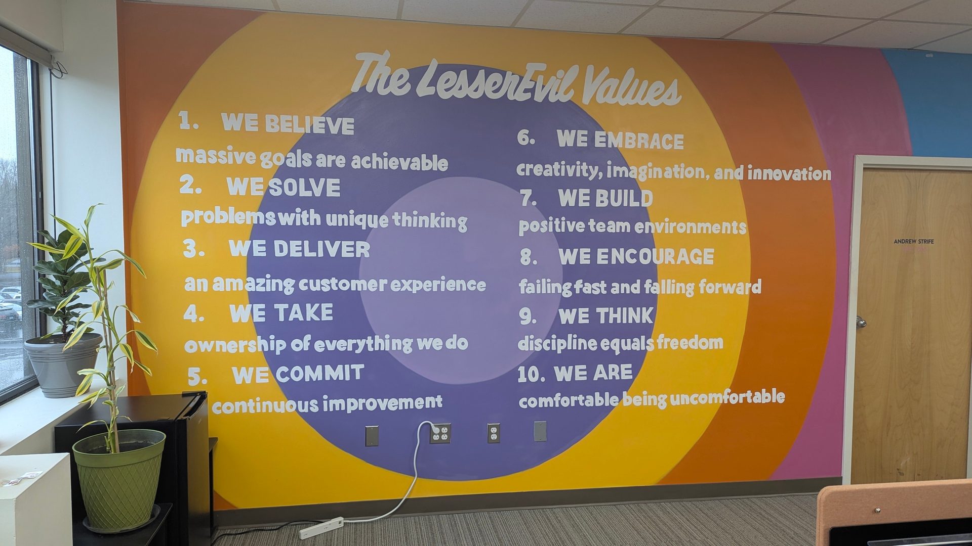 Visitors to the Danbury offices are likely to notice the brightly colored walls, with whimsical decorations scattered throughout the offices and common areas. The building is pet-friendly, so you’ll encounter the occasional dog strolling around or snoozing in a bed next to his owner’s desk. Coristine says he spends much of his day out with the staff, only retreating to his office when he needs to hunker down and focus.